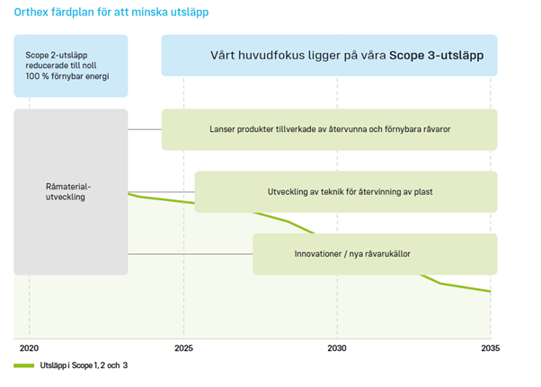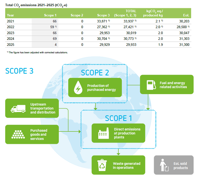 Merparten av våra utsläpp av växthusgaser härrör från köpta varor och tjänster, såsom råvaruutvinning, och uttjänta produkter, såsom förbränning av produkter för energi. Det senare är uteslutet från vårt mål att minska våra utsläpp. Detta beror på vår begränsade förmåga att påverka konsumenternas beteende – oavsett om de återvinner eller kasserar våra produkter efter användning – men också för att det är svårt att utvärdera hur återvinningen av plast utvecklas.