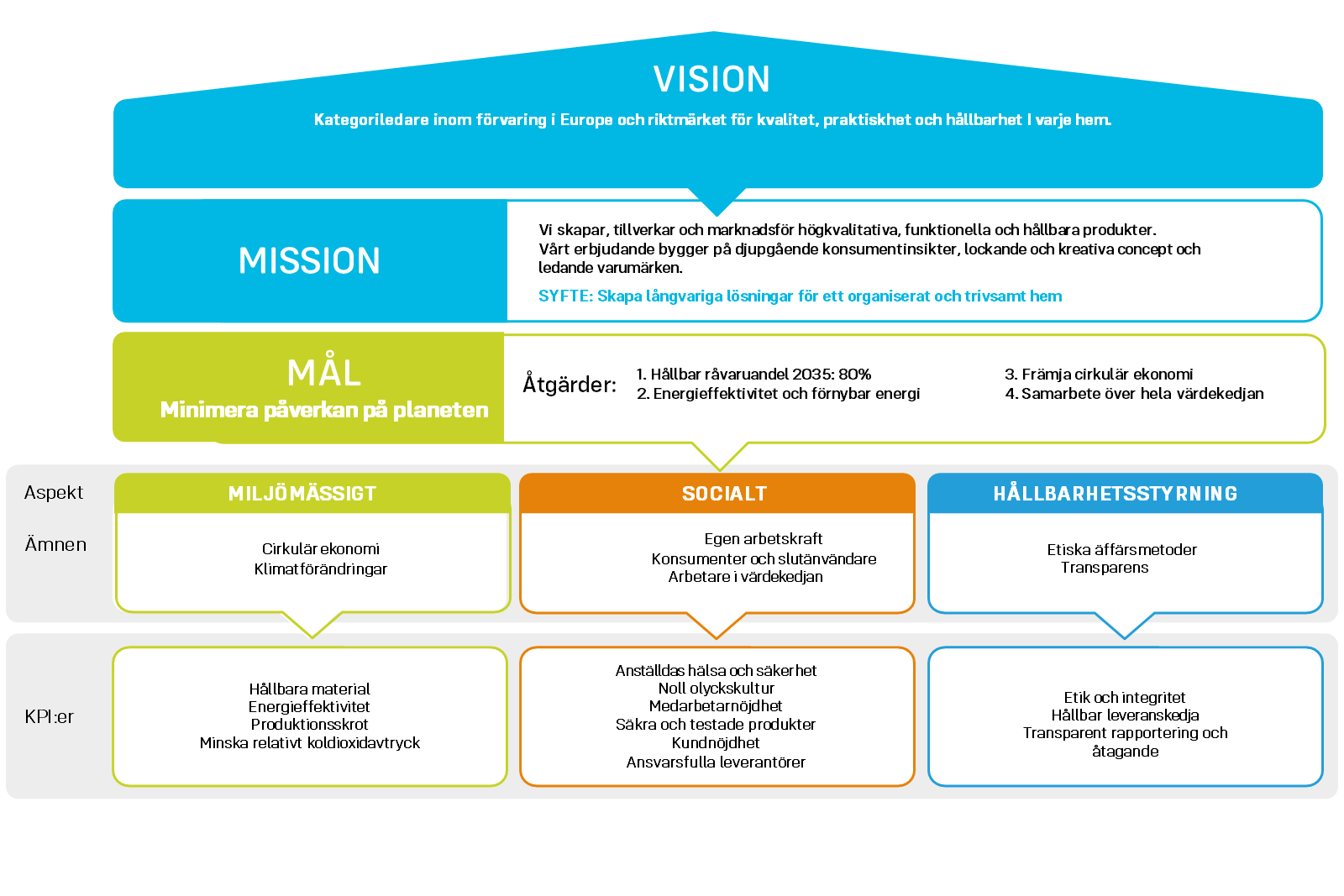 På Orthex definieras vår hållbarhetsstrategi inom områdena miljöansvar, socialt ansvar och hållbarhetssyrning (ESG). Ämnena basers på väsentlighetsanalysen som genomfördes 2025. För varje ämne har vi definierat nyckeltal (KPI) och satt upp mål.