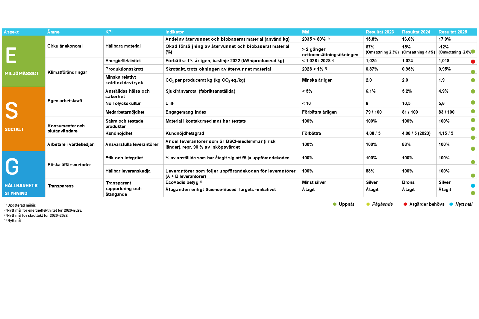 Orthex hållbarhetsstrategi, relevanta hållbarhetsämnen och fastställda indikatorer, mål och resultat som uppnåddes 2025 illustreras nedan.